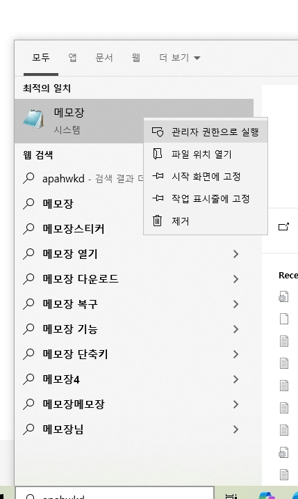 - 메모장 아이콘에서 마우스 우클릭 → 관리자 권한으로 실행